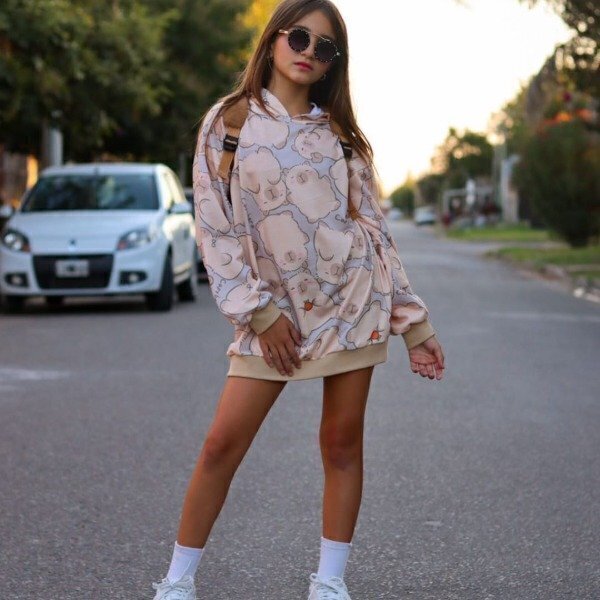 Telas, diseños y detalles: Maxi buzo con capucha sublimado confeccionado en acetato sin frisa.