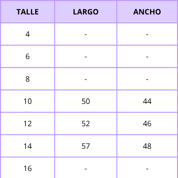 Tabla de talles: Antes de realizar tu compra, te recomendamos consultar nuestra Guía de Talles para asegurarte de que las prendas se ajustan perfectamente. Cada niño y preadolescente crece a su propio ritmo, por lo que es importante revisar las medidas de cada talla y compararlas con las de tu hij@. Te sugerimos medir el largo y ancho de alguna prenda de tu peque sobre una superficie plana, para elegir el talle más adecuado. Si estás entre dos talles, opta por elegir el más grande para mayor comodidad y duración. ¡Así te aseguras de que cada prenda le quede a la perfección! Recuerda que las MEDIDAS están representadas en centímetros y son APROXIMADAS.